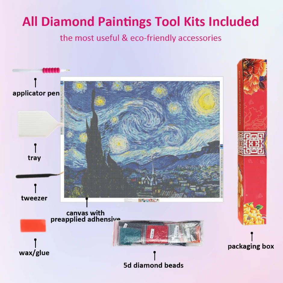 Bring Van Gogh’s Starry Night to life with shimmering detail. This diamond painting kit captures the swirling skies and vivid colors of the masterpiece, offering a relaxing creative escape and a dazzling artwork to showcase in your home.